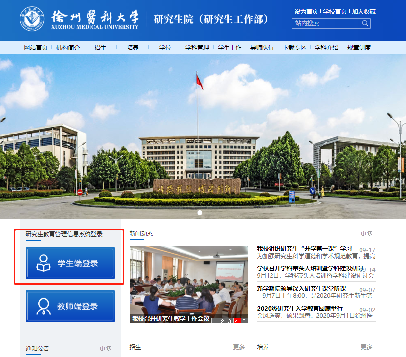研究生院官方网站http://yjs.xzhmu.edu.cn/index.htm,“研究生教育信息管理系统”-“学生端登录”,账号为学号(见附件),密码为个人八位数生日,例:19900401。